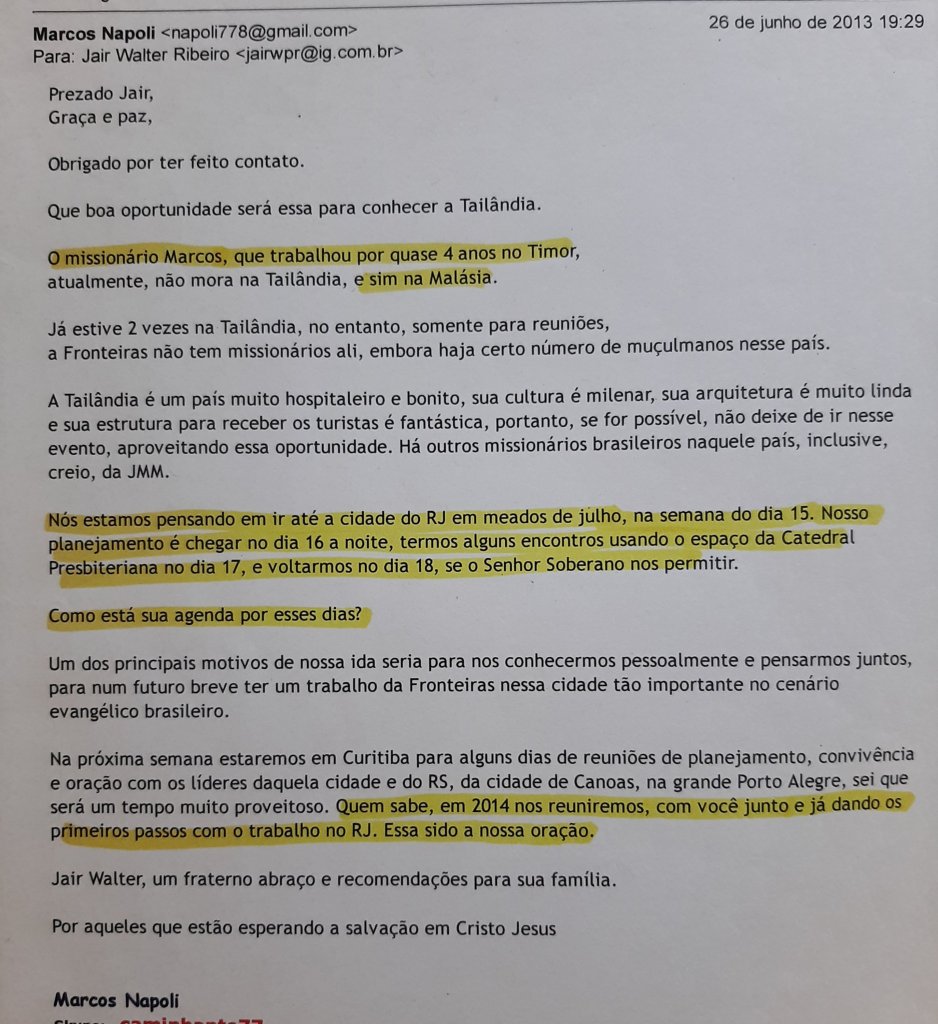 Em 26 de junho de 2013 recebi resposta de um e-mail solicitando sobre informações do ministério do trabalho missionário na Tailândia. Na verdade, estava interessado em participar do 7° Conferência Lausanne de Pesquisadores que seria realizada em Kuala Lumpur na Malásia.
