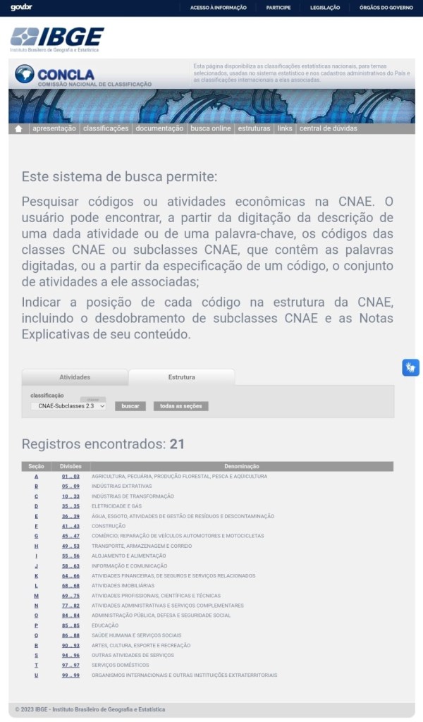 Os CNAEs foram oficializados através da Resolução do IBGE/CONCLA (Figura 1), do dia 4 de setembro de 2006. Direcionada tecnicamente pelo IBGE (Instituto Brasileiro de Geografia e Estatística), o CNAE é coordenado pela Secretaria da Receita Federal. Formado por uma combinação de 7 números, eles representam a junção de seções, grupos, divisões, classes e subclasses.