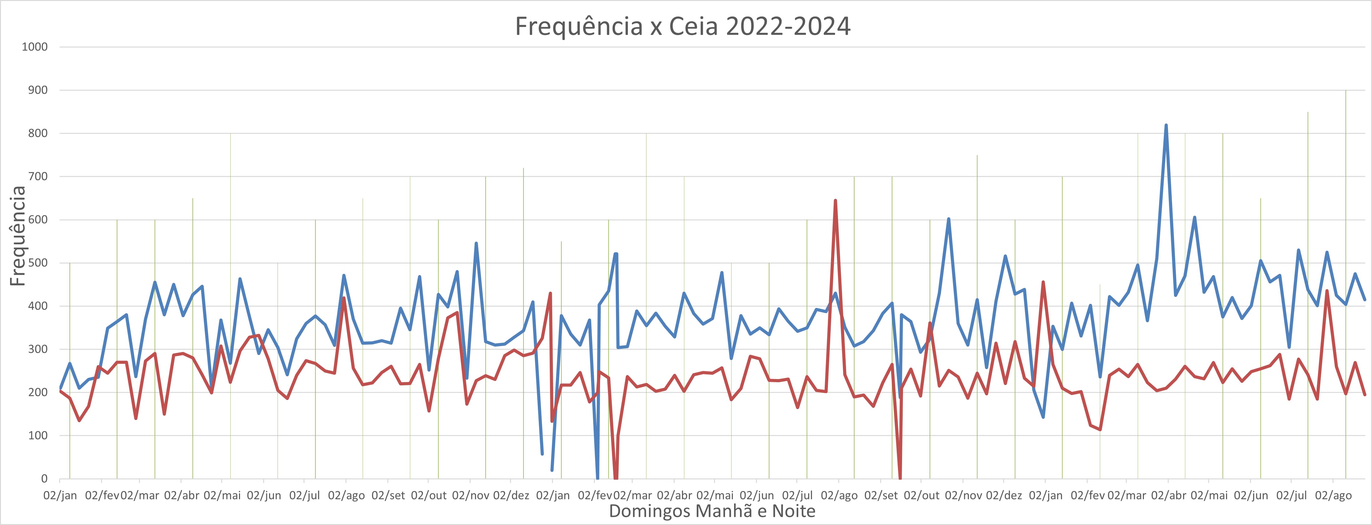 Este estudo baseia-se na análise de dados provenientes do levantamento de frequência realizado pela equipe de Recepção da igreja. Foram utilizados códigos em Python para realizar a análise descritiva das séries temporais relativas aos cultos dominicais de janeiro de 2022 a agosto de 2024.